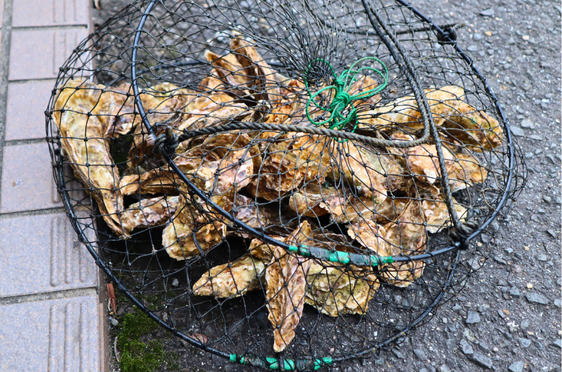 チヌの食害対策では、カキをかごに入れる「永田式」でチヌの攻撃を防ぐことができました。成長したカキのためにカゴを交換するなど、とても手間がかかりますが1つ課題をクリア。